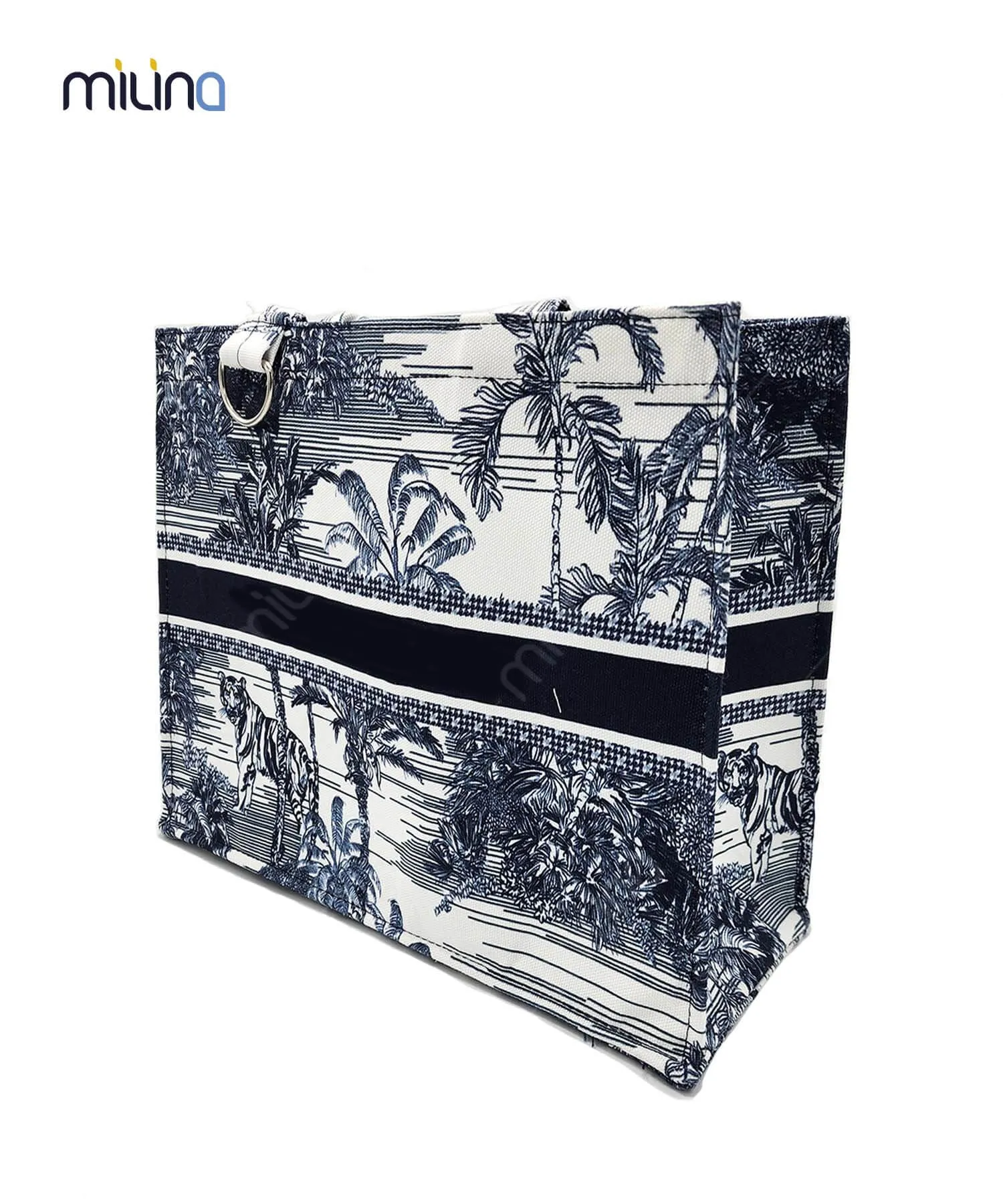 รับผลิตกระเป๋าช้อปปิ้ง สันข้าง แนวนอน ขนาดใหญ่ วัสดุทำจากผ้าแคนวาสเสริมด้วยวีราเน่เพื่อให้เพิ่มให้กระเป๋าตั้งอยู่ทรง พร้อมสายสะพายทำจากผ้าชนิดเดียวกันเสริมเชือกเพื่อความทนทาน ด้านในซับในด้วยผ้าทีซีสีกรมเพื่อความสวยงาม ก้นกระเป๋าเสริมด้วยแผ่นรองก้นเพื่อความคงทน ลายบนกระเป๋าสกรีนด้วยกระบวนการซับลิเมชั่น (Sublimation) ตัวอักษรบนกระเป๋าเป็นงานปัก สามารถเลือกลายสกรีนหรือโลโก้ได้ตามต้องการ